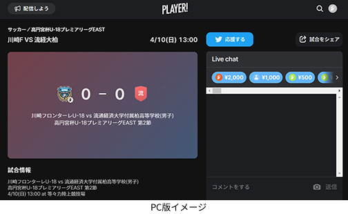 今シーズンもフロンターレアカデミーの選手たちの戦いぶりをタイムリーに皆さんにお届けするため、スポーツライブエンターテイメントアプリ「Player!」にて試合速報を実施します。
