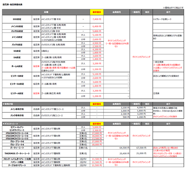 | 価格 | ダイナミックプライシング ※車椅子席、パーティーシート、企画シートはダイナミックプライシング対象外となります。 |