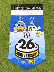 川崎市内をフロンターレカラーで染めるとともに、市内の商店街の活性化も目的として掲出しているフロンターレタペストリー。何度かデザインを変更しながら10年以上にわたり掲出され、多くの市民やサポーターの皆様にフロンターレを身近に感じていただいています。