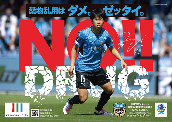 この度、川崎市健康福祉局が製作する薬物乱用防止啓発ポスターに、当クラブの佐々木旭選手が採用されましたので、お知らせいたします。