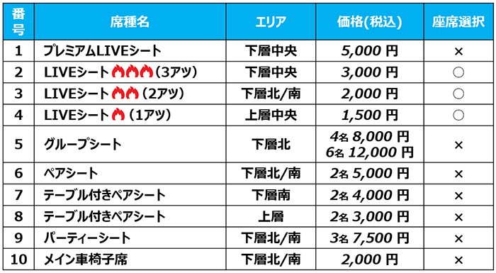 激アツLIVEを近くで快適に見られる特等席をご用意いたしました。全席指定席なので席取りは不要です。
