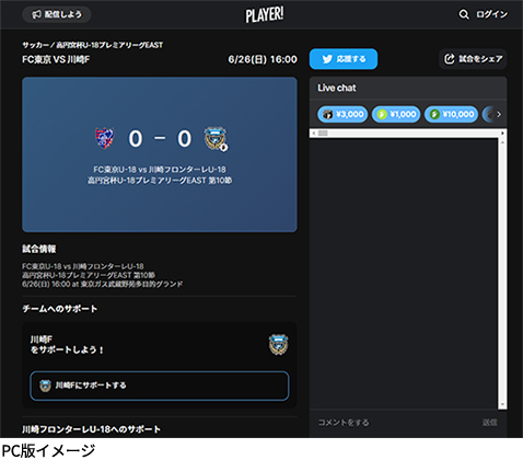 今節は試合観戦に制限が設けられる中で、フロンターレアカデミーの選手たちの戦いぶりをタイムリーに皆さんにお届けするため、スポーツライブエンターテイメントアプリ「Player!」にて試合速報を実施します。コメントを書き込むこともできますので、皆さんぜひご覧ください。