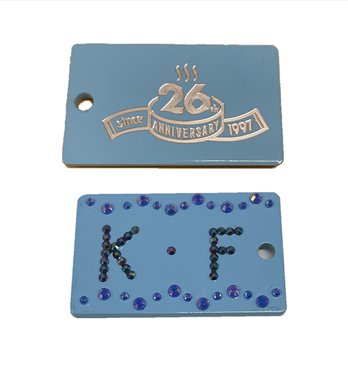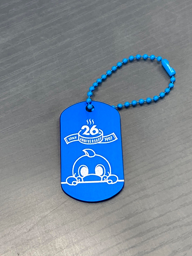レーザーマーカーという技術を活用し好きな文字を入れてオリジナルキーホルダーを作ろう! 今年の表面は、26周年ロゴとお風呂に浸かったふろん太をデザインしました!