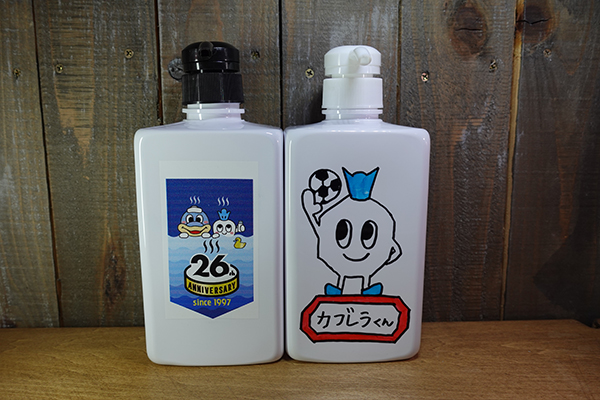 ふろん太はシャンプー!! 26周年ロゴはリンス!! と、それぞれのお家の目印に。これでシャンプーとリンスの順番を間違える心配なし!!
