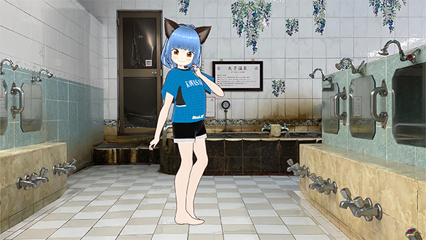 カメラに向かって体を動かすと画面の中の「カワサキまるこ」があなたの動きを再現!! 背景は、川崎市中原区に実在する銭湯「丸子温泉」を使用!! 本物の銭湯内でVTuberを体験しよう!!