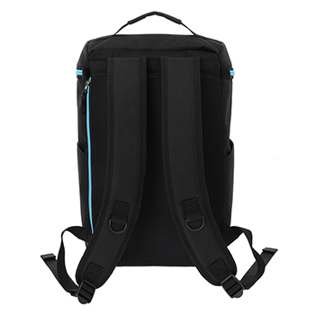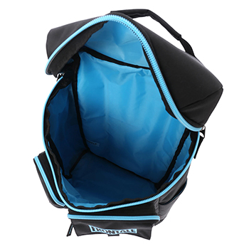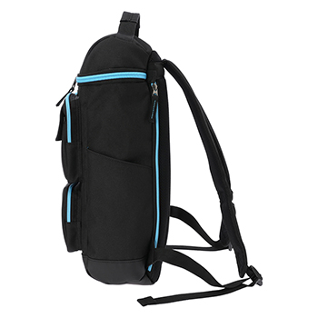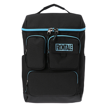前面に小分けできる収納ポケットが3つ付いているバックパックです。ブラックボディにファスナー部分をフロンターレブルーにしたシンプルな仕様です。