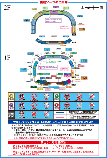 | ・大旗(Lフラッグサイズ[1,015×1,575mm]を超える旗)の使用について ホームA自由(応援中心エリア、ゴール裏1階北)、ビジターA自由(ゴール裏1階南)でのみ使用可(掲げる、振る等) ※但し、試合・イベント等の運営の妨げとなるため、ホームA自由(応援中心エリア)の最前列では使用できません。 ※Lフラッグサイズ[1,015×1,575mm]以下のものは全てのエリアで使用可 ※なお、使用の際は自席にて周囲の方の迷惑にならないようご配慮ください。 |