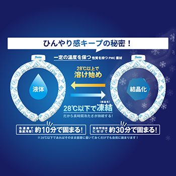 | 使用方法 | 水につけたり、冷蔵庫や保冷バッグに入れたり、28度以下の環境で凍結します。 ※冷凍庫で冷やすことで、より早く冷たく凍結が可能です。 |