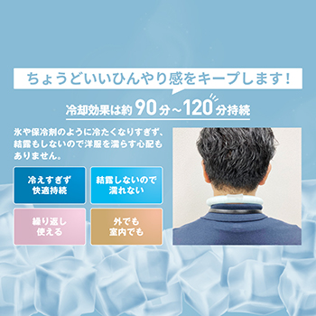 28℃で凍結するNASA開発の最先端素材「PCM」を使用したネッククーラーです。PCM素材は熱を吸収・発散することで一定の温度を保ちます。最大約120分冷たさをキープし、心地良い温度で首を効率的に冷やすので、熱中症対策にオススメです! また、氷のように冷えすぎないのでお肌へのダメージも抑えられます。