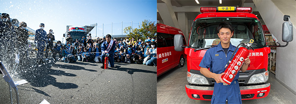 ①水消火器体験 ②防火服体験 ③救命体験(胸骨圧迫・AED) |