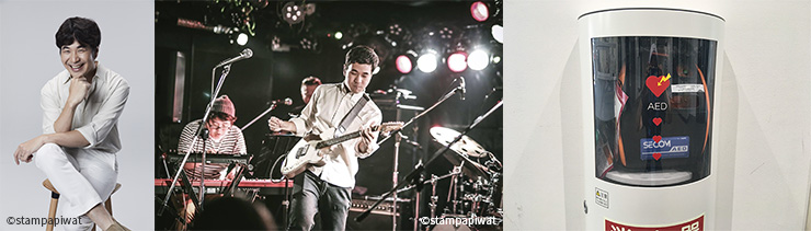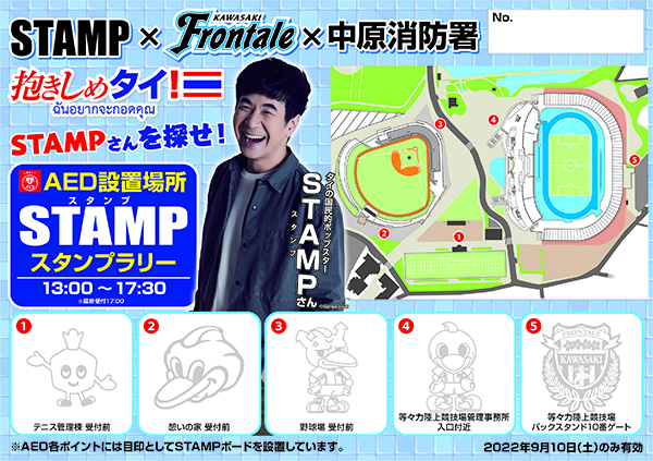 「抱きしめタイ!」イベントに来場するタイのポップスター・STAMPさんの写真を目印に、等々力緑地内に設置されている5つ全てのAEDを見つけよう! AED設置場所でスタンプをゲットすると、STAMPさん×フロンターレ×中原消防署がトリプルコラボしたオリジナルステッカーをプレゼント!