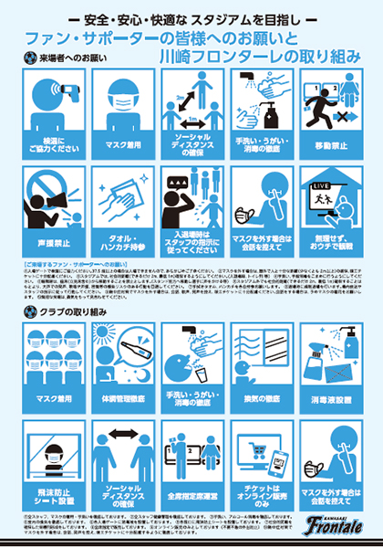 クラブとしてもこれまで以上に感染拡大防止の取り組みを実施してまいりますが、Jリーグを安全に開催するためには、ファン・サポーターの皆様のご協力が不可欠となりますので、何卒よろしくお願いいたします。 スタジアム内で撮影された全映像(静止画を含む)は、報道等を目的とした各種番組や各種の物販・販促等に使用される場合があります。 |
