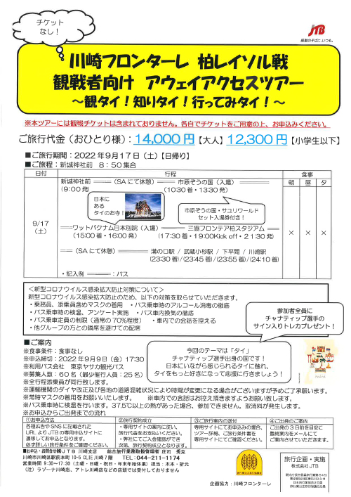 (株)JTB川崎支店では、「9月17日(土)vs柏レイソル」の川崎フロンターレ・アウェイアクセスツアーの参加者を募集いたします。