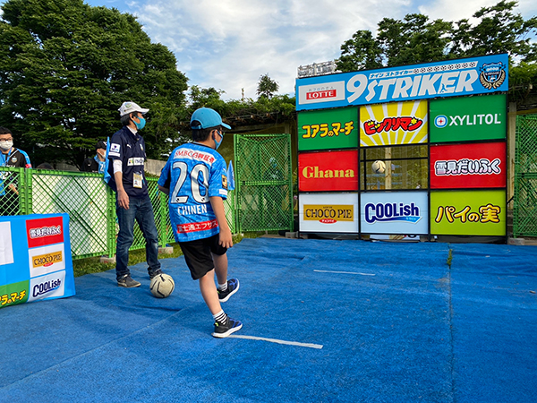 ロッテのお菓子のデザインが的となったド迫力キックアトラクション「9(ナイン)ストライカー」では、カワハロ開催記念として当てた看板のお菓子がもらえます!! 好きなお菓子を狙ってシュート!!>