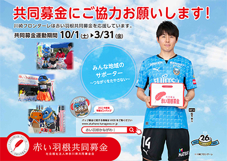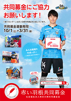川崎フロンターレでは、社会福祉法人 神奈川県共同募金会が実施する「赤い羽根共同募金」の川崎市内で行う募金運動に関して、今年度も協力することになりましたのでお知らせ致します。