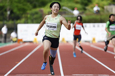 ブレードと呼ばれるカーボン素材の競技用義足を実際に装着しトラックを走ってみよう! この日イベントに参加している高桑早生選手も体験コーナーに顔を出しますよ!