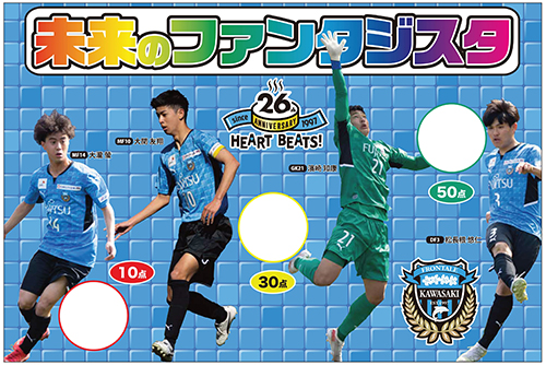| ルール | 3球蹴っていただき、入った得点に応じてトレカをプレゼント! ~10点:トレカ1枚 |