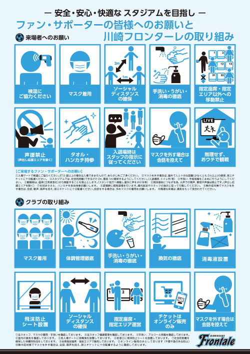 川崎フロンターレでは、新型コロナウイルス感染拡大防止を徹底し『安全・安心・快適』なスタジアムを目指し引き続き、尽力いたします。皆様のご理解とご協力をお願い申し上げます。