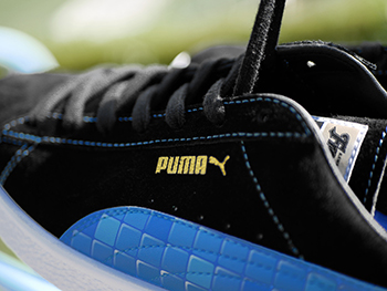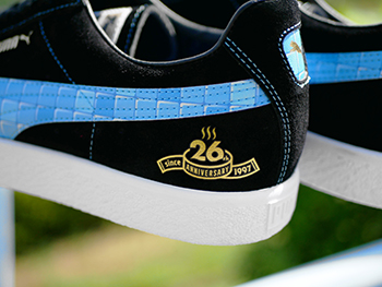 アッパーには、日本最大の皮革産業地域である兵庫県姫路市で生産された「姫路レザー」を採用し、歴史的に古くから続く生産手法によって、革本来の風合いを最大限に活かした「プレミアムスエード」を採用。フォームストリップとインソールには、フロンターレと深い繋がりのある風呂(フロ)のタイルからインスピレーションを受けた今シーズンのユニホームのグラフィックがプリントされています。シュータンにはフロンターレのロゴ入りの特別な織ネームが採用され、インソールには、フロンターレ、atmos、プーマのロゴがプリントされたクラブ設立26(フロ)周年のアニバーサリーイヤーを記念するにふさわしいこだわりの一足に仕上がっています。