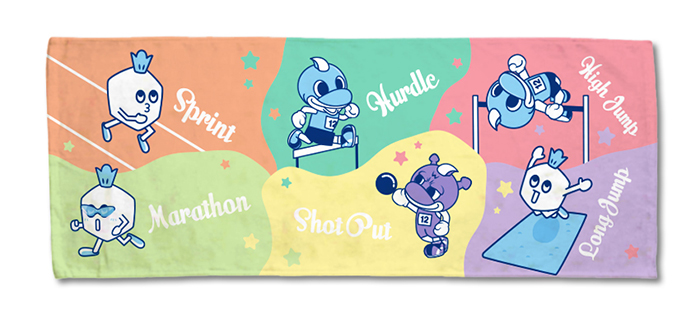 陸上競技をしているふろん太とカブレラのイラストが特徴的なフェイスタオルです。スポーツのお供に。