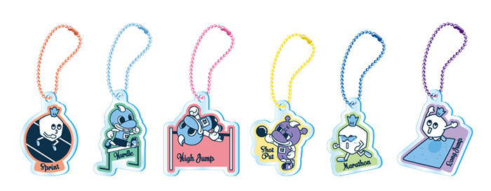 陸上競技に挑戦するふろん太&カブレラとカラフルなボールチェーンがかわいいマスコットアクリルキーホルダーです。短距離走、ハードル、マラソン、走り高跳び、走り幅跳び、砲丸投げがラインナップ。