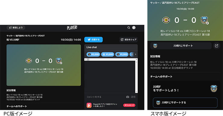 今節は試合観戦に制限が設けられるため、フロンターレアカデミーの選手たちの戦いぶりをタイムリーに皆さまへお届けするため、スポーツライブエンターテイメントアプリ「Player!」にて試合速報を実施します。コメントを書き込むこともできますので、皆さまぜひご覧ください。