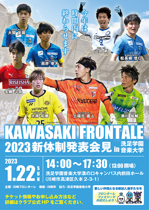 川崎フロンターレでは、2023シーズンの新体制発表会見を「洗足学園音楽大学」にて実施いたしますので、お知らせいたします。