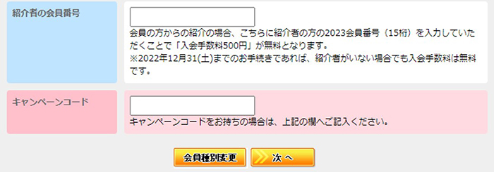 ご入会の際に、入会ページの「紹介者の会員番号」欄に紹介者の会員番号をご入力ください。