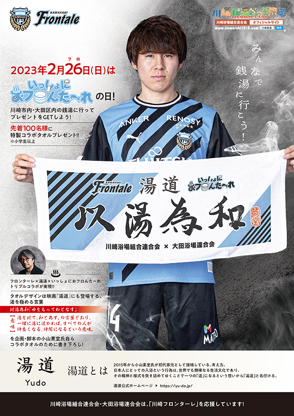 さらに、『湯道』さんとのコラボも決定! 当日は、『湯道』×『川崎浴場組合連合会』&『大田浴場連合会』×『川崎フロンターレ』のトリプルコラボタオルをプレゼントいたします。