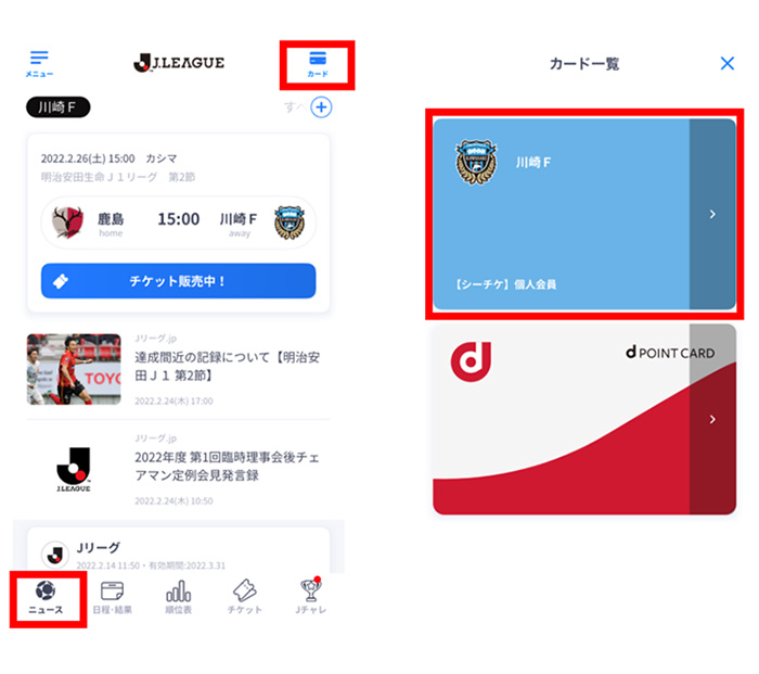 A:Jリーグ公式アプリ「Club J.LEAGUE」内の「ニュース」画面の右上に表示される「カード」から「川崎F」のカードをご選択ください。