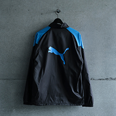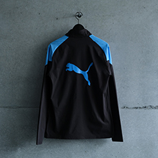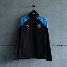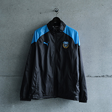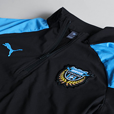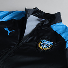 選手が試合前にウォーミングアップをする時に着用するトレーニングウェア。ブラックボディに差し色でフロンターレブルーを使い、ストリートウェアとしても使いやすくなっています。