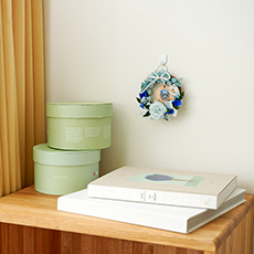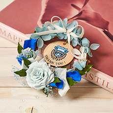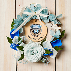 川崎フロンターレオリジナルカラーとなっているプリザーブドフラワー。中心部分にはクラブのエンブレムとシンプルなメッセージをデザインした木製タグを配置しました。
