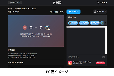 今シーズンもフロンターレアカデミーの選手たちの戦いぶりをタイムリーに皆さんにお届けするため、スポーツライブエンターテイメントアプリ「Player!」にて試合速報を実施します。