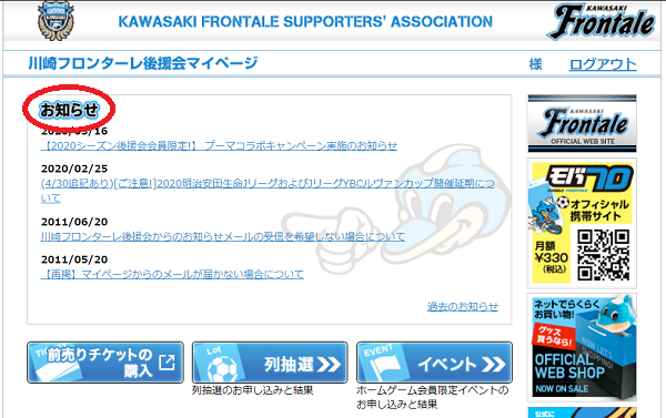 [1]川崎フロンターレ後援会マイページにログインする。