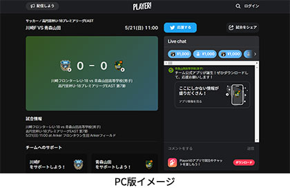 今シーズンもフロンターレアカデミーの選手たちの戦いぶりをタイムリーに皆さんにお届けするため、スポーツライブエンターテイメントアプリ「Player!」にて試合速報を実施します。