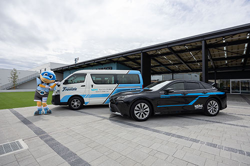 Anker フロンタウン生田オープンに伴い、同施設に貸与いただいたオリジナルラッピングの燃料電池車「MIRAI」と「ハイエース」2台を展示いたします。車体に応援メッセージがラッピングされた状態で初お披露目!! 当日はハーフタイムも競技場内を走行いたします。お楽しみに!!