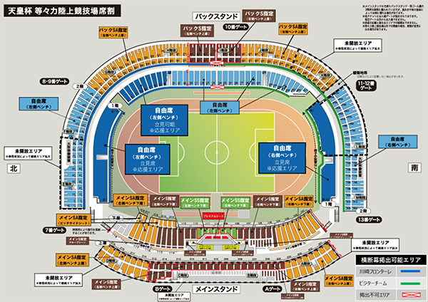 ※「立ち上がっての応援」「鳴り物の使用」「大旗の使用」については、「1階自由席(応援エリア)」のみ可能となり、その他のエリアでは不可となります。