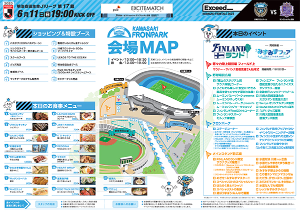 また、川崎市上下水道局主催による「みずみずフェア」も同日開催。この日の試合は19時キックオフですが、FINLANDランドはキックオフ6時間前の13:00スタート(テントサウナは何とキックオフ10時間前の9:00!)です。
