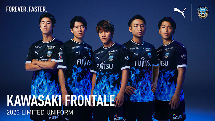 2023シーズンLIMITED UNIFORMは、PUMAグローバルコンセプトである『CELEBRATING THE ROOTS』に基づき、川崎エリアの工場地域からインスピレーションを得た青い炎を採用。