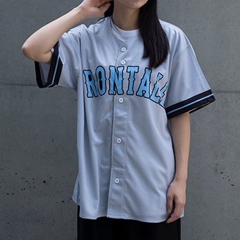落ち着きのあるグレーにフロンターレブルーを差し色にしたデザインと、淡いフロンターレブルーが夏らしさを感じさせる2デザインを展開します。前開きなので化粧や髪型の崩れがなく、サッと着られるものベースボールシャツのポイントです。
