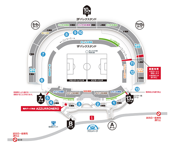 メインスタンド場内総合案内所横「AZZURRO NERO in等々力」前(コンコース側)