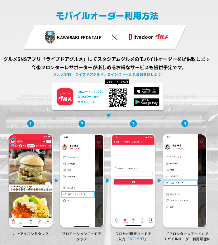 ・今回のモバイルオーダーはファン感謝デー来場者限定となります。川崎フロンターレ後援会に入会されていない方は購入しても受け取れませんのでご注意ください。
