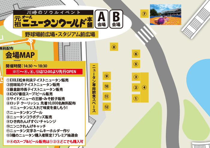 本イベントでは、「最強ニュータンマニアはオレだ!」を自負する川崎市副市長・藤倉茂起さん、元フロンターレ選手で現在強化部スカウト担当の田坂祐介さん、川崎市出身EXILEメンバーのMATSUこと松本利夫さんの3氏それぞれが激推しする「3種類のニュータンタンメン販売」のほか、この日限定で味わうことができる「ニュータン幻の7番目スープ販売」、「定番サイドメニュー・みそ餃子販売」など充実のフードコートが登場!