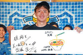川崎市幸区鹿島田出身・元フロンターレ選手でニュータン大好きな齋藤学選手がオールニュータンワールド盛り上げに全面協力! 小さい頃によく通ったという元祖ニュータンタンメン本舗・鹿島田店を、期間限定で「元祖ニューサイトウマナブ本舗」にフルモデルチェンジ!