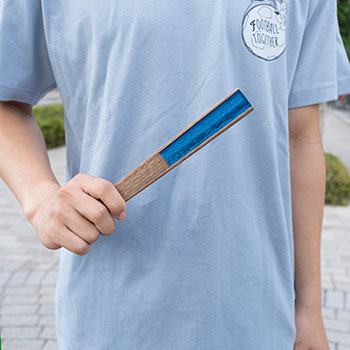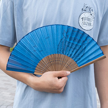広げた時の扇形により、自然の風を感じることができるのが扇子の良さ。扇面部分は、友禅染めの技法のひとつでもある捺染を追求した京都の染色工場で、丁寧に染め上げています。また、扇骨も京都の扇子処が吟味した竹材を用いています。中骨部分にカブレラのヘタがデザインされているのもポイントです!