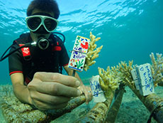 サンゴの村を宣言し、SDGSやサンゴの保全に積極的に取り組む恩納村の活動に、スポーツの力を通じて、持続可能でよりよい世の中の実現への貢献を目指す川崎フロンターレが賛同し、植付用サンゴの苗を括り付けるフロンターレオリジナルの台座へのコラボが実現!