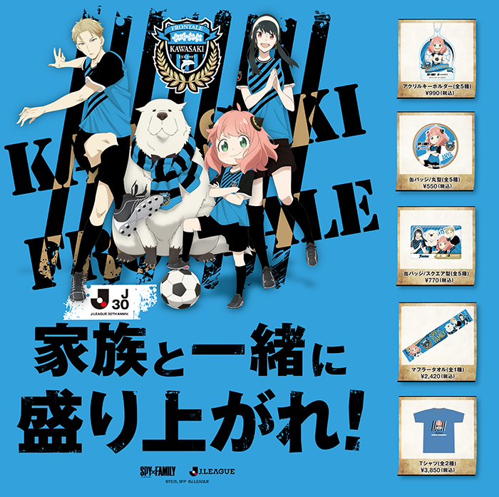 アーニャを始め、ロイド、ヨル、ボンドのSPY×FAMILYの大人気キャラクターが川崎フロンターレのウェアを着用した、オリジナルデザイングッズを販売いたします。