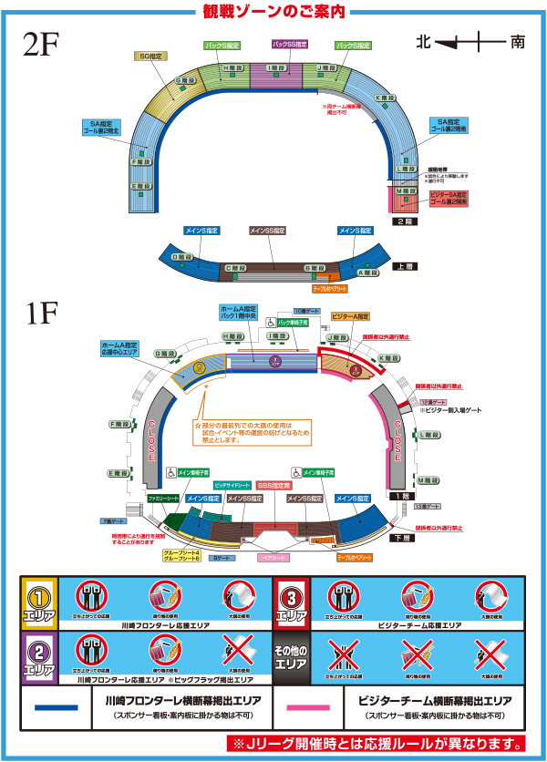※「バック1階中央」はビッグフラッグ掲出エリアとなっており、選手入場時もしくは試合前の、選手ウォーミングアップ開始時、掲出活動を行っております。また、試合によりその他のエリアで掲出を行う可能性がありますので、皆様のご理解とご協力をよろしくお願いいたします。