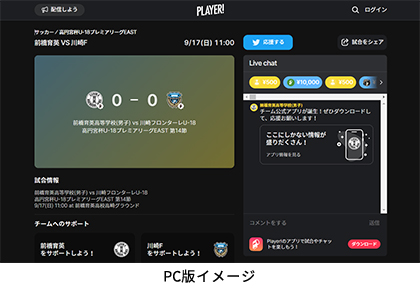今シーズンもフロンターレアカデミーの選手たちの戦いぶりをタイムリーに皆さんにお届けするため、スポーツライブエンターテイメントアプリ「Player!」にて試合速報を実施します。