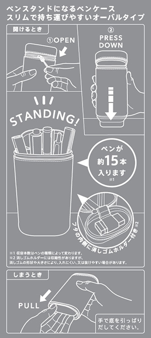 やわらかく手触りのいいシリコン素材で作られた『立つ』ペンケースです。上部ファスナーを開いて、机などの上で上から押すと底面が本体部に押し込まれペンケースがペンスタンドになります! また、しまう時は本体に押し込まれた部分を引っ張るだけで飛び出た部分が収納できる、シリコンの特性を活かした新しいタイプのペンケースです。フタの裏側部分にはゴム製のホルダーが付いています。